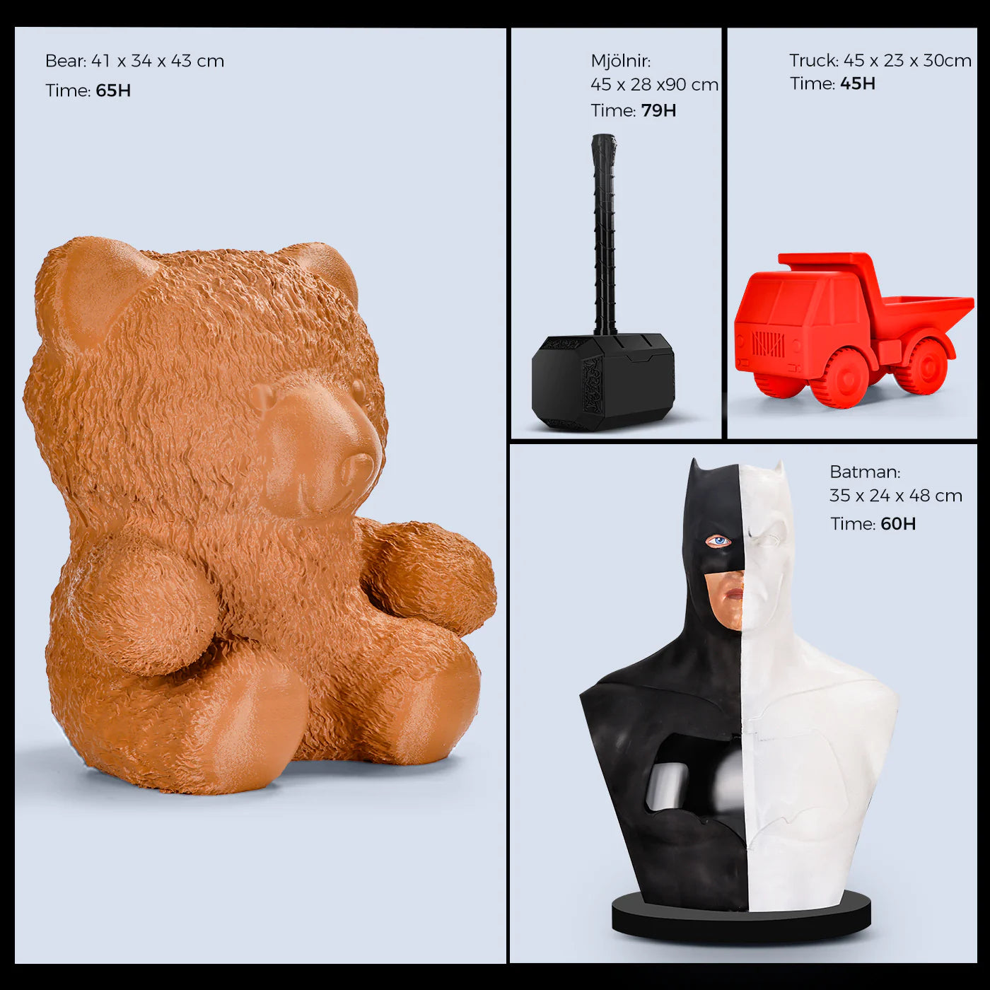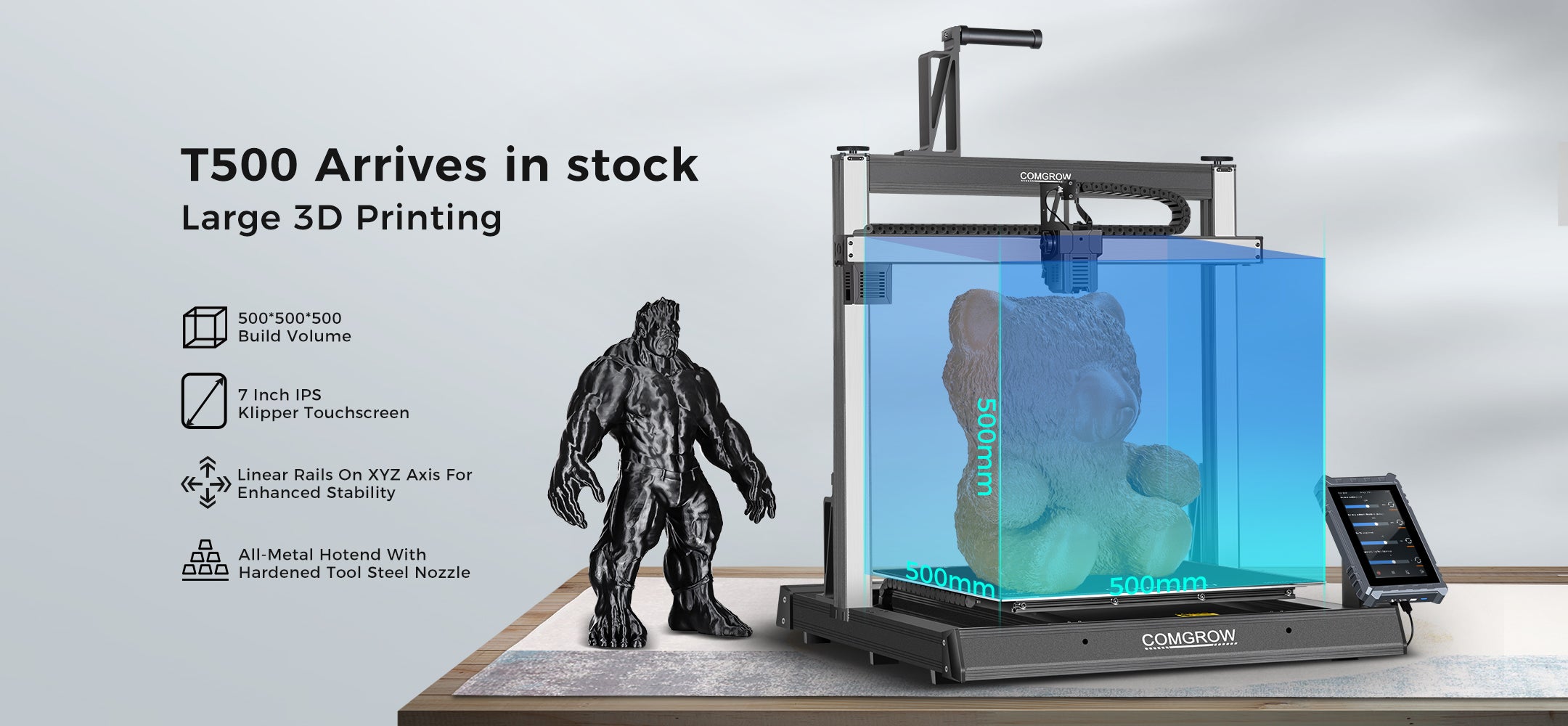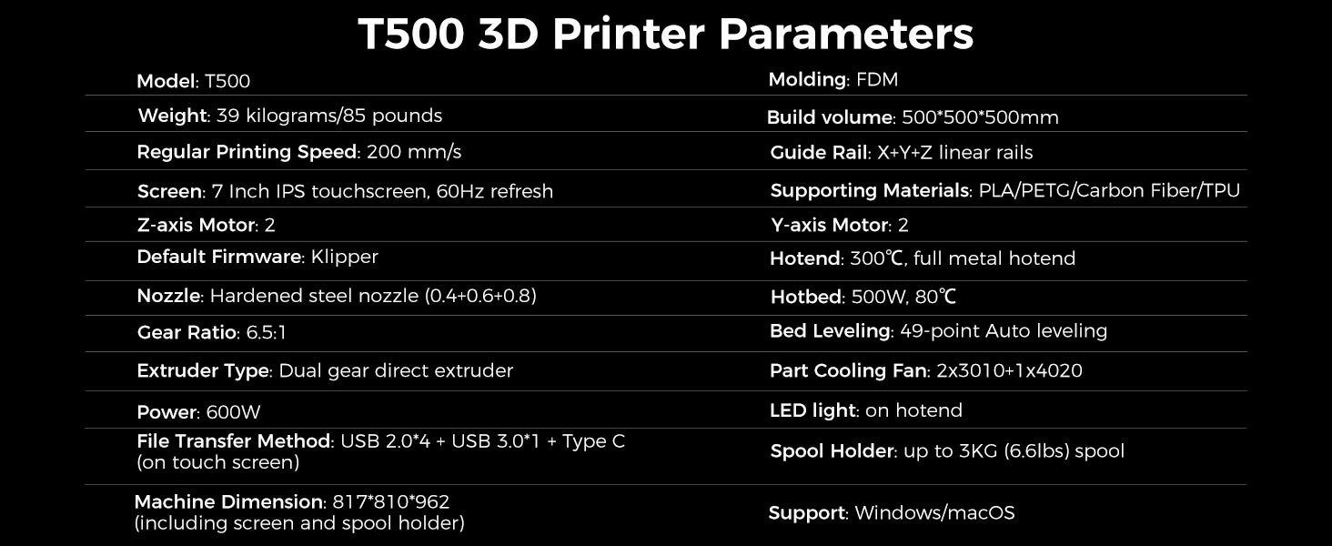 Comgrow T500 3D printer can print 19.68*19.68*19.68in large-size models, enabling you to bring grand-scale projects to life with exceptional finesse. Also, you can reach the batch production on the large printing area at one time, saving you time waiting for the models.
